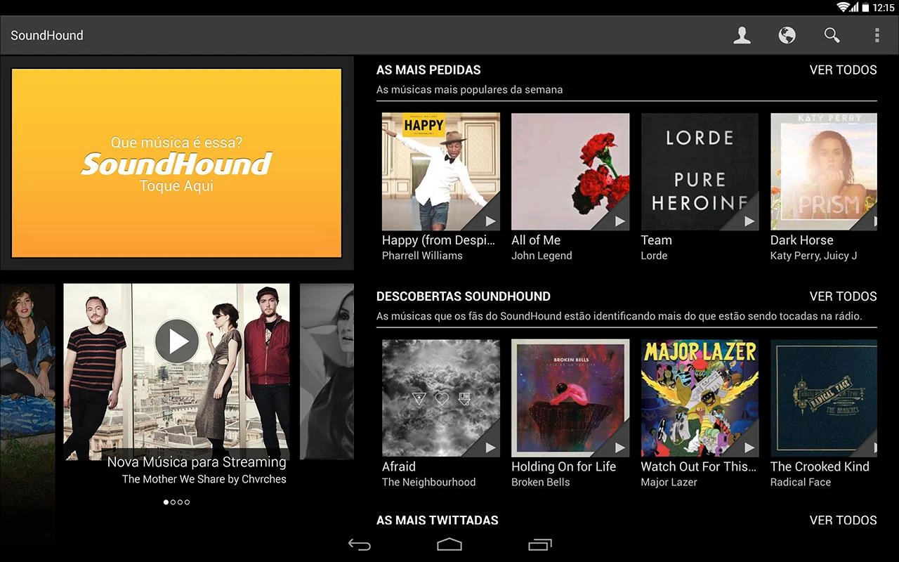 ◦ SoundHound Notícias: traz transmissão em fluxo de músicas grátis, novos artistas e muito mais